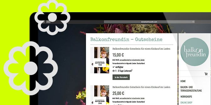 Auf Ihrer Website hat Sandra eine neue Rubrik im Online-Shop mit Gutscheinen etabliert. BRAVO! https://www.balkonfreundin.com/online-shop/gutscheine/